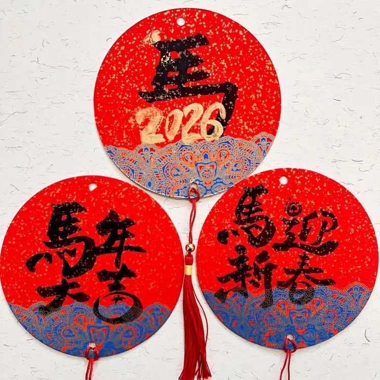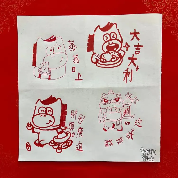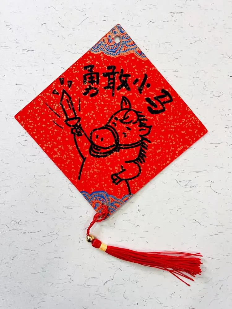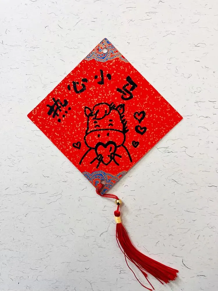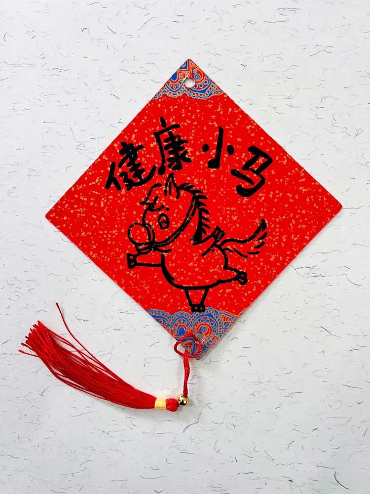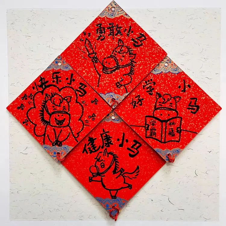 红底洒金的挂饰上,“马迎新春”“马年大吉”的字样笔力稚拙却满是喜庆;四格漫画里的小胖马,配着“财源广进”“蒸蒸日上”的吉语,把市井烟火里的年味,晕染在宣纸上。这些作品不仅是童趣的表达,更是孩子们对传统年俗的温柔诠释。