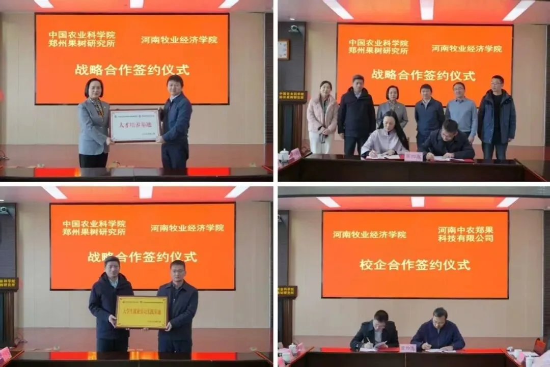 在与会领导见证下,尹新明代表学校接受郑州果树研究授予的“人才培养基地”牌匾;马珺代表学校与郑州果树研究所签署校所战略合作协议;岳彩军代表学校授予郑州果树研究所“大学生就业实习实践基地”牌匾;河南牧业经济学院物流与电商学院院长任佳佳与河南中农郑果公司总经理马凌珂签署共建电商新媒体校企研发中心协议。