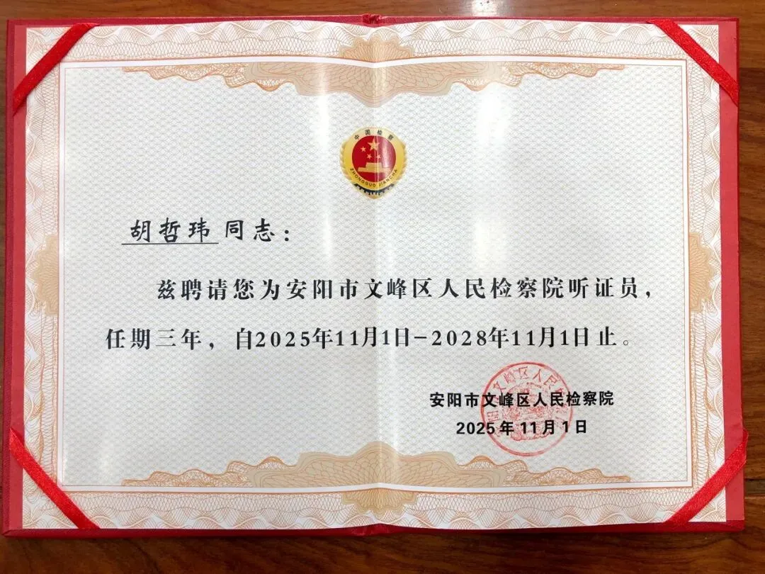 2月4日上午,安阳市文峰区人民检察院召开听证大会,为新当选的听证员正式颁发聘任证书。安阳市浙江商会党支部书记、执行会长胡哲玮受邀参会,作为此次新当选的听证员之一,接过聘任证书,正式肩负起听证员的光荣职责与使命,以商会党建力量助力司法公正建设。文峰区人民检察院党组书记、检察长呼雪峰出席大会,为全体新当选的听证员颁发了聘任证书,对新当选的听证员表示热烈祝贺,并嘱托大家要牢记听证使命、恪守履职纪律,充分发挥自身行业优势和专业特长,助力检察机关高质效办案。随后,新任听证员认真学习了《检察听证员履职手册》,进一步加深了对检察听证工作流程、职能作用的全面了解,为今后依法履职打牢了基础。胡哲玮书记当选检察院听证员后,将倍加珍惜这份荣誉与责任,始终以党建为引领,牢记听证员职责,主动加强检察业务知识和法律法规学习,严格遵守听证工作纪律和保密规定,坚持客观公正、实事求是,立足商会职能和自身工作经验,积极参与听证活动,认真履行听证职责,努力在司法办案与商会服务之间搭建沟通桥梁,为维护社会和谐稳定、推进法治文峰建设贡献商会力量。