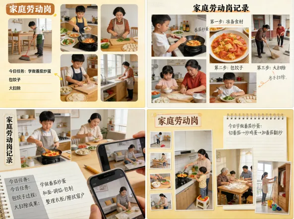 设立家庭劳动岗,每天坚持做家务,学做一道家常菜,参与包饺子、大扫除等劳动,用照片、文字记录过程。