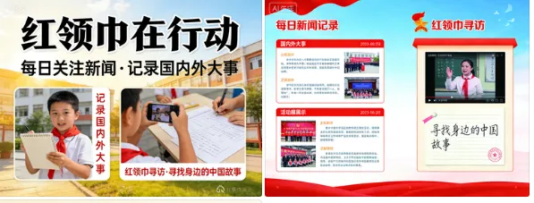 每日关注新闻,记录一件国内外大事;开展“红领巾寻访”活动,用视频、手记等形式寻找身边的“中国故事”。