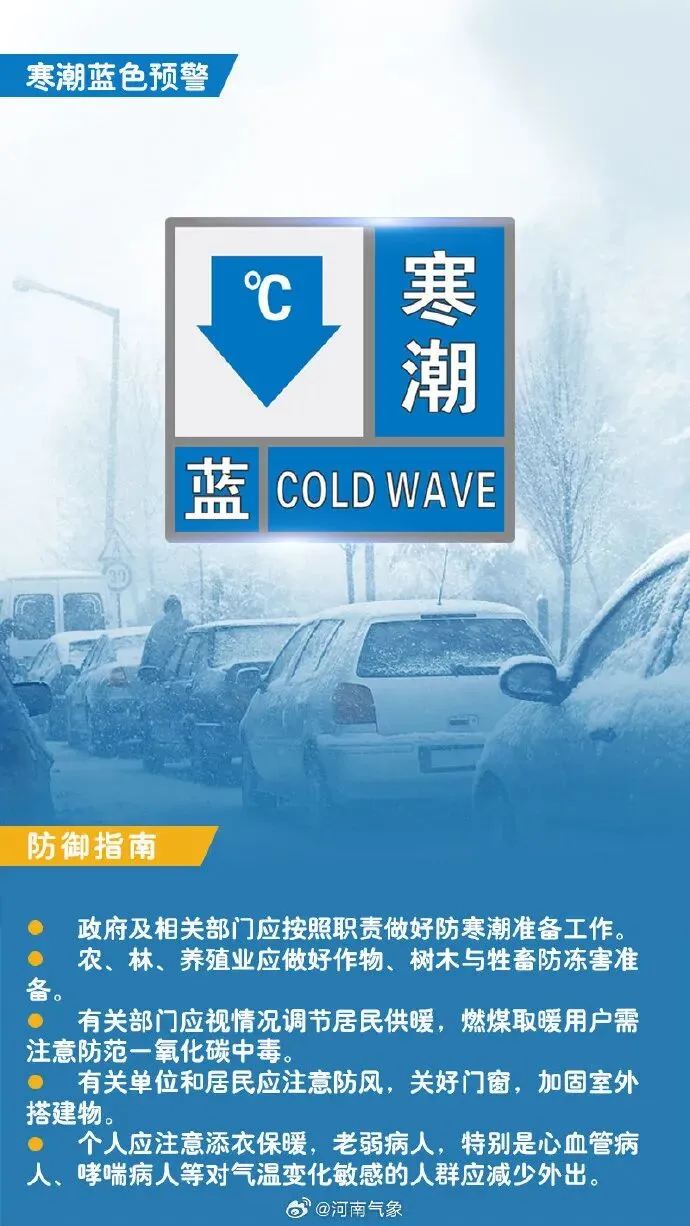 郑州市气象台2026年2月5日11时25分发布寒潮蓝色预警信号:预计7日凌晨较5日凌晨,郑州市主城区、航空港区、上街区所辖乡镇及街道最低气温将下降8℃左右,7日凌晨最低气温降至零下5℃。5日下午至6日白天全市东北风3到4级,阵风6-7级。请注意防范寒潮天气产生的不利影响。