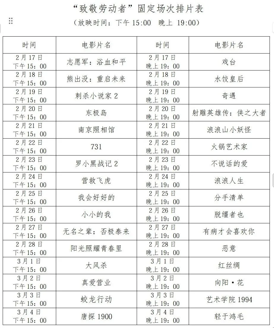 洛阳市总工会2026年春节“送文化”——“致敬劳动者”职工观影活动,观影时间为2月17日(正月初一)—3月4日(正月十六),放映时间为每天15:00;19:00两场。