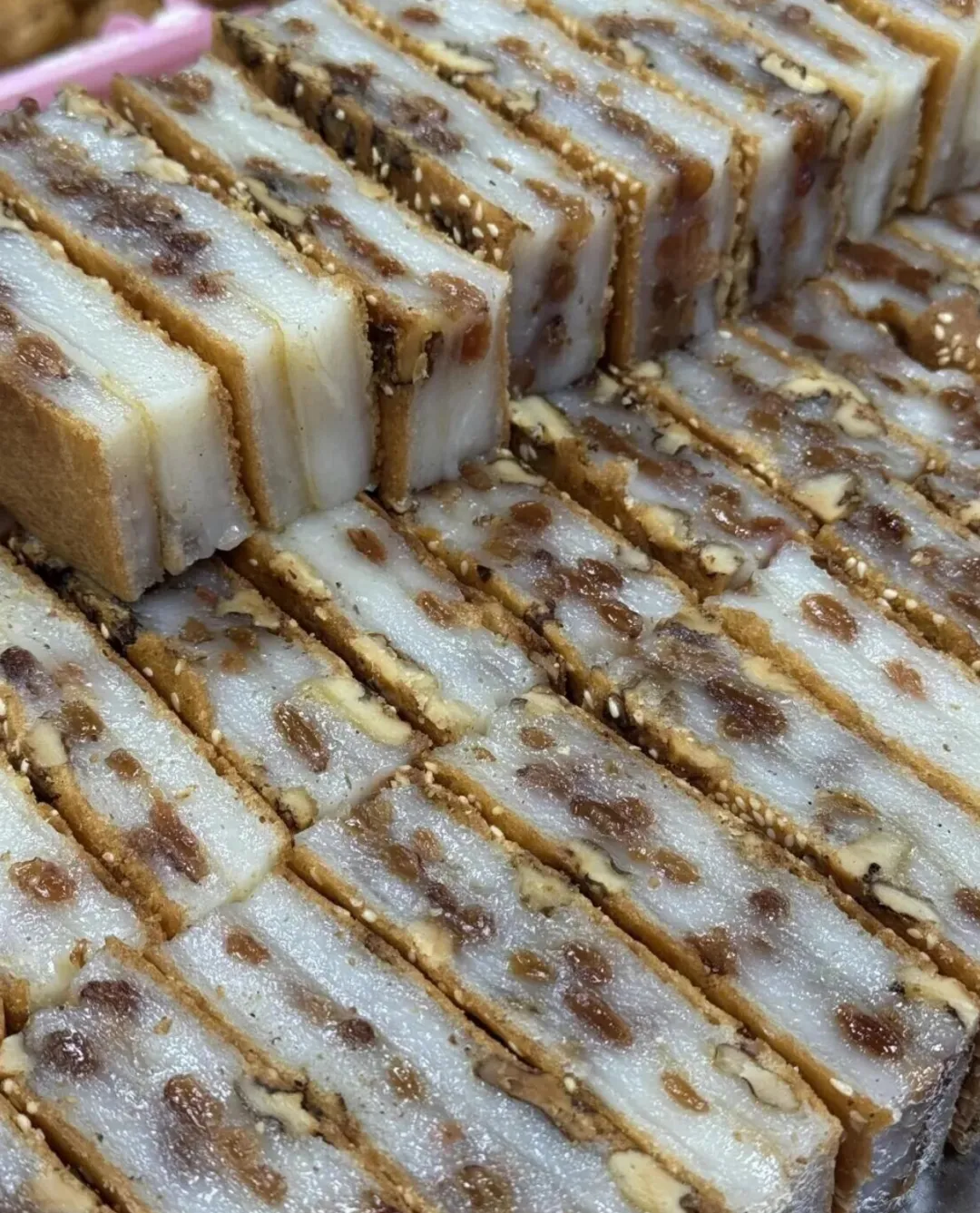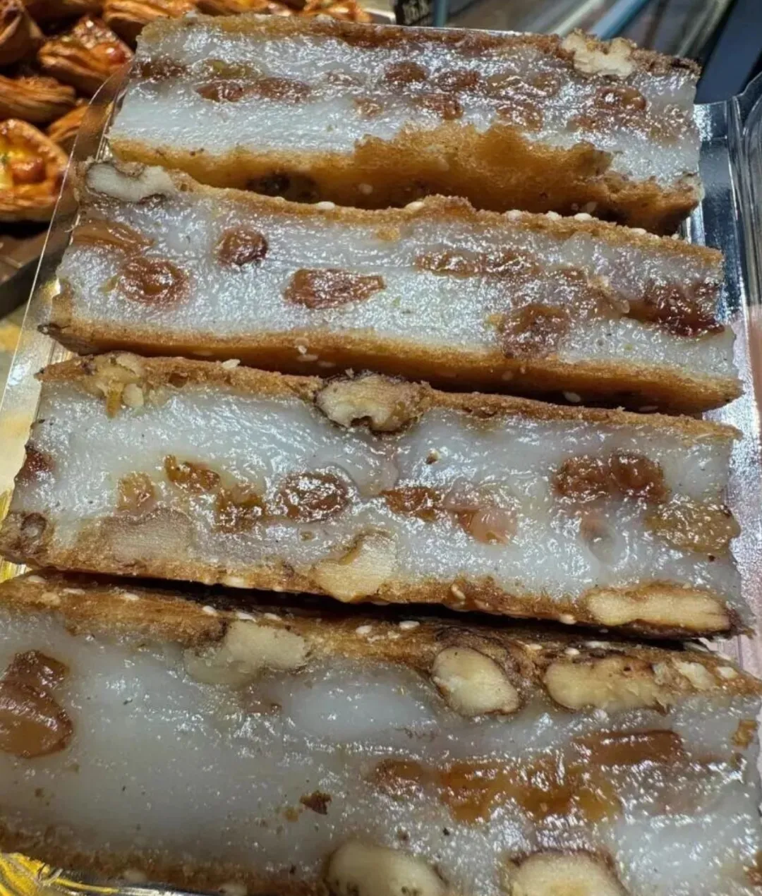 我凑过去看了看 , 这个糕切面挺好看的 , 中间是白色半透明的 , 里面能看到核桃仁和葡萄干 , 上下两层是金黄色的 , 沾着芝麻。老板说可以试吃 , 给我切了一小块。