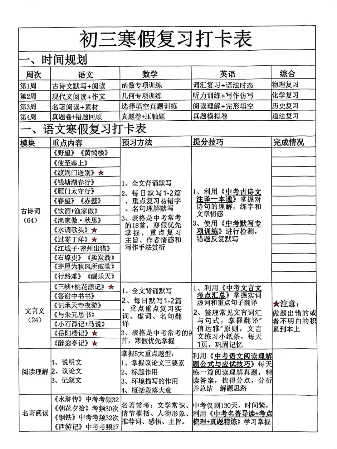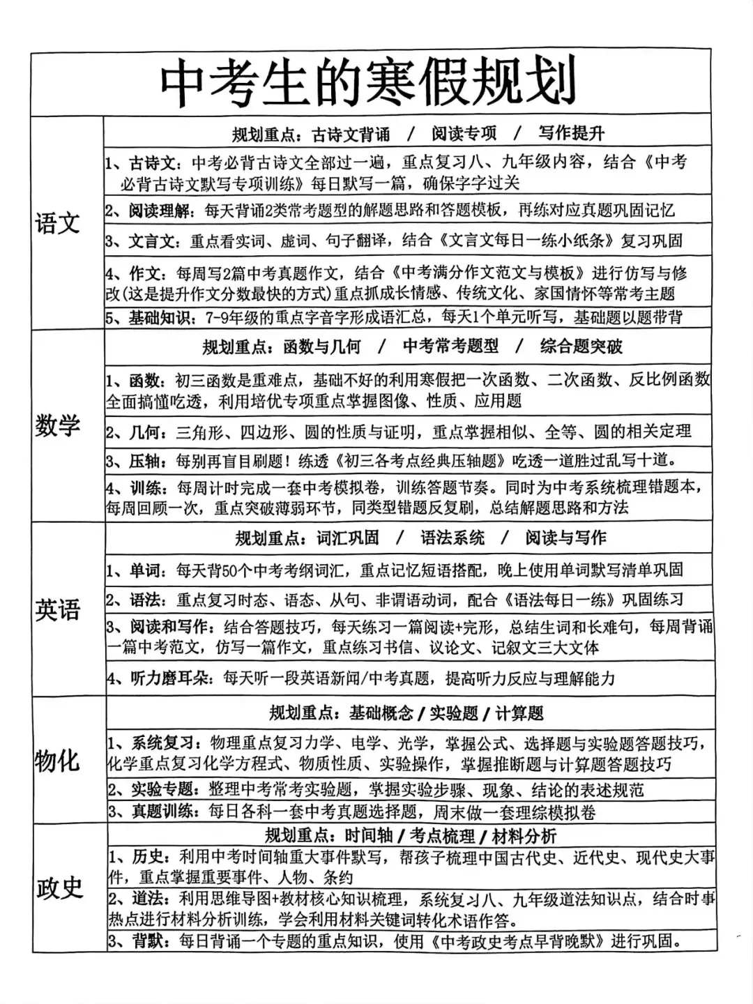 2026年寒假已经到了,对于今年参加中考的孩子来说,可以说时间是非常紧张了,春节过后紧挨着就是一模,体育实验考试!作为九年级如何利用好寒假时间,显得非常重要,某校清北班学生寒假复习规划供大家在寒假期间学习参考!祝所有参加中考的孩子利用好寒假时间,金榜题名!