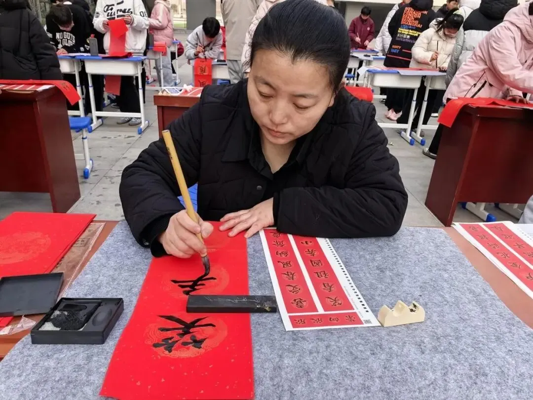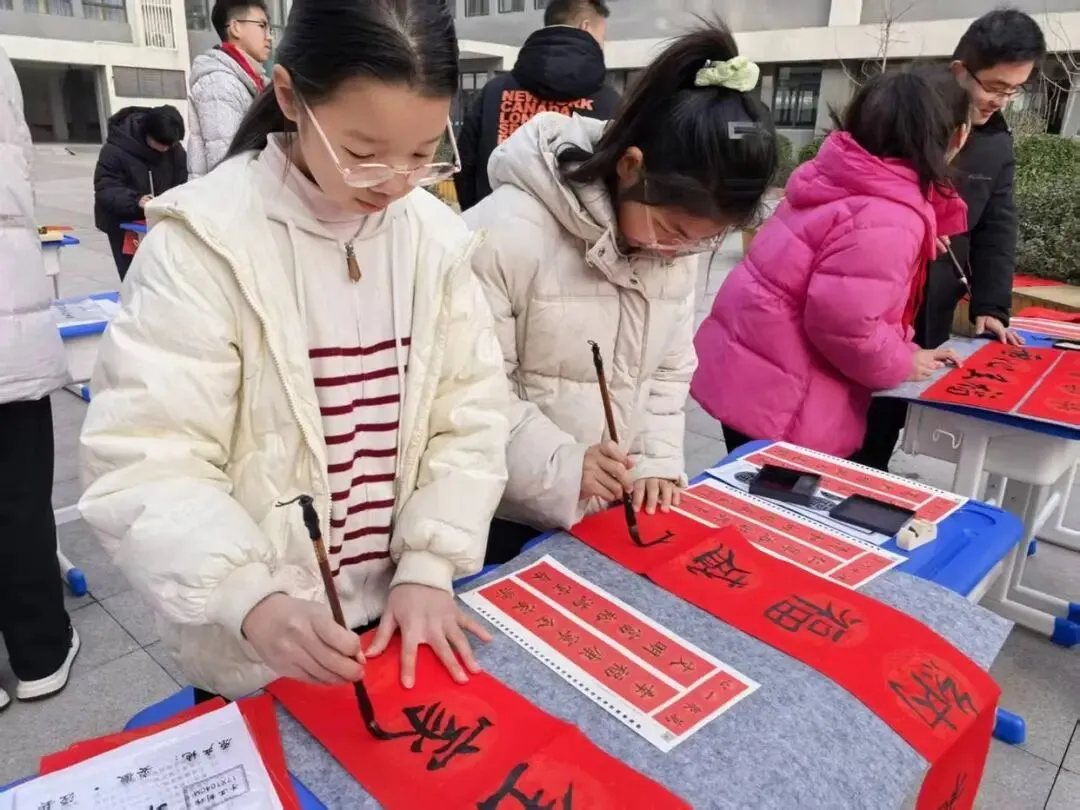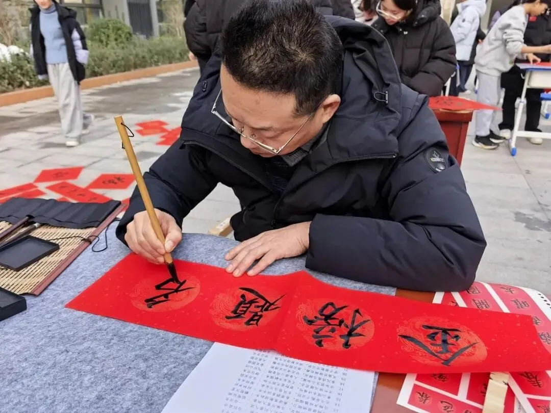 学校师生与家长代表也不甘示弱,纷纷拿起毛笔参与其中。有的同学虽笔法略显稚嫩,却专注认真,一笔一画都饱含着对新年的憧憬;教师们则从容挥洒,将教育者的温润与期许融入笔墨;家长们更是踊跃参与,与孩子并肩书写,在墨香中感受亲子温情与传统文化的魅力。现场不时传来阵阵赞叹,大家互相欣赏、交流心得,每一副春联都承载着对新年的美好祝福,对学校发展的殷切期许,对美好生活的无限向往。
