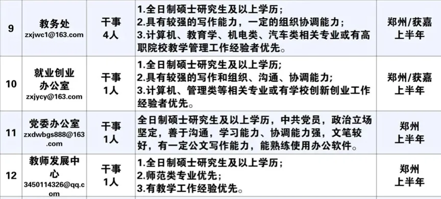邮件标题请注明XX(应聘部门)—XX(应聘岗位)—XX(专业)—XX(学历)—XX(学校)—XX(姓名),如:信息学院—计算机网络教师—计算机科学与技术—硕士—郑州大学—张三。个人简历应包含学历、工作经历、政治面貌、家庭住址、所获荣誉、职称、科研成果、最快上岗时间等情况。有留学经历的人员,还需附上护照出入境记录页扫描件。