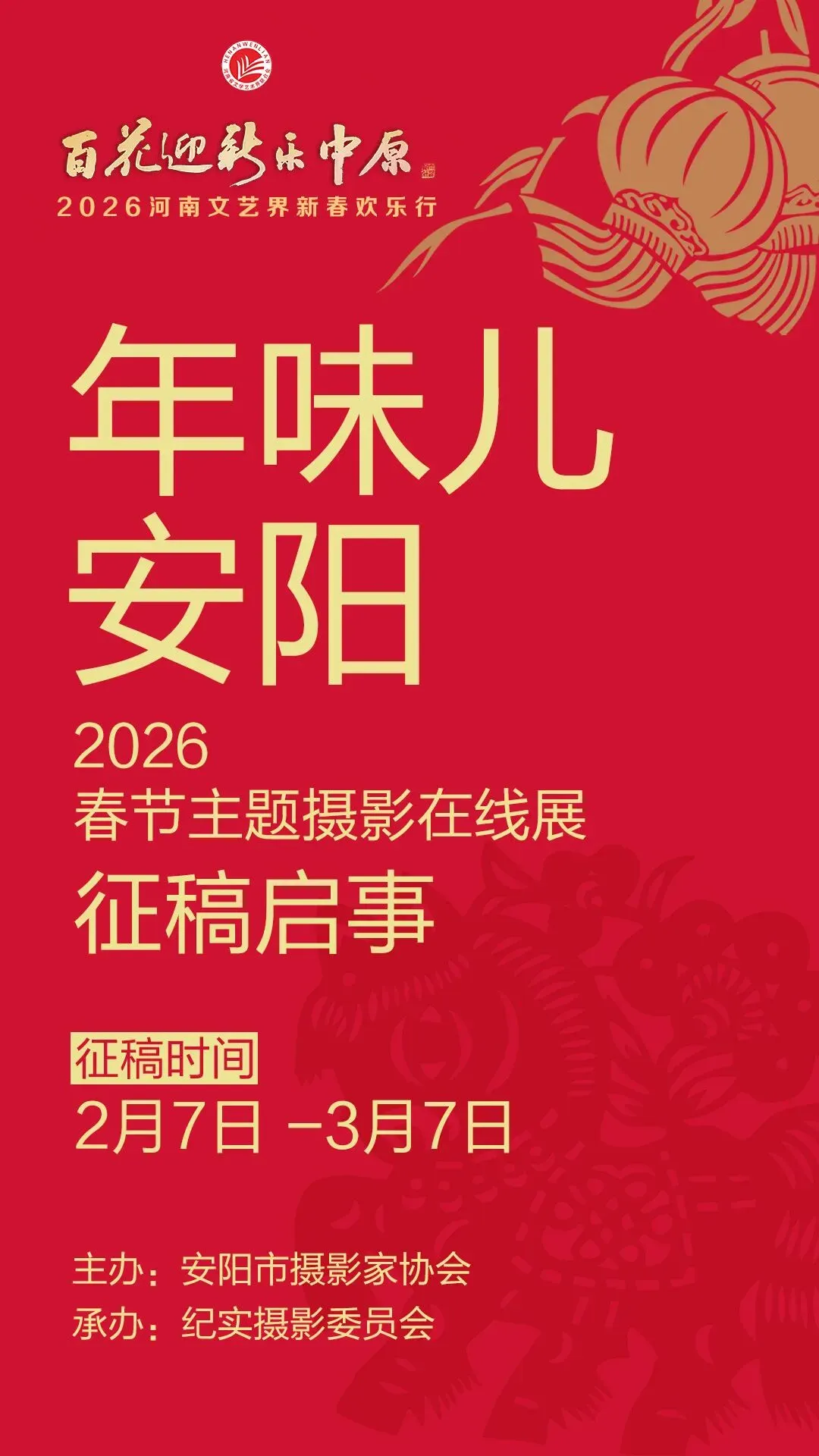 为积极响应河南省文联“百花迎新乐中原--2026河南文艺界新春欢乐行”系列活动,用镜头记录、展示我市春节期间和谐、喜庆的盛景,安阳市摄影家协会特举办“年味儿安阳”2026春节主题摄影在线展活动,现面向我市广大摄影爱好者征稿,诚邀您用光影绘就马年新春的动人画卷。非安阳市摄影家协会会员的,此次入展作品可作为入会条件之一。聚焦安阳市春节期间的百态风情与温暖瞬间,挖掘节日背后的文化底蕴与时代内涵。重点征集以下内容:1. 马年新韵:捕捉含“马”元素的年俗场景,如“马”主题春联、剪纸、灯饰,寓意“一马当先”“马到成功”的民俗活动,以及融入马年创意的新春装饰与祝福场景。2. 民俗寻根:记录醒狮闹春、非遗展演、庙会社火、元宵赏灯等传统年俗活动,定格手工技艺传承、传统仪式举办的鲜活瞬间;3. 团圆暖景:聚焦春运归途的期盼、年夜饭的温馨、家人团聚的欢笑、邻里互道的祝福,展现亲情友情的温暖联结。4. 城韵年味:拍摄安阳城乡的新春风貌,如写春联、办年货、街巷灯笼点缀、广场光影秀、景区节庆氛围,以及城市建设与传统年味交融的独特景致;5. 坚守之光:定格春节期间坚守岗位的劳动者工作的身影,彰显责任与担当。征稿时间为:2026年2月7日(农历腊月二十)至2026年3月7日(农历正月十九)。在征稿期间,广大摄影爱好者可随时投稿,主办方将择优在“安阳摄影家”微信公众号上展出。最终从展出作品中选出“最佳作品”、“优秀作品”、“入展作品”若干,并颁发荣誉证书。1.作品须是征稿时间内在安阳境内拍摄的原创作品,内容健康向上,主题鲜明,富有感染力,能真实反映安阳的春节氛围与文化特色。2.摄影作品:可为单幅或组照(组照每组不超过6张),格式为JPG,长边不小于2500像素,文件大小不低于2MB;不接受电脑合成、AI生成及过度修图的作品。3.短视频作品:格式为MP4,分辨率为1920×1080,时长30秒至3分钟,以横屏为主,要求无水印、无角标,画面流畅、配音清晰。4.所有作品需附简要文字说明,包括作品标题、拍摄时间、地点及100字以内的内容描述,便于解读作品内涵;5.投稿者应对作品拥有独立、完整的著作权,不得侵犯他人的著作权、肖像权、名誉权等合法权益,若有纠纷由投稿者自行承担责任。2. 邮件主题命名格式为:年味儿安阳+作者姓名+作者电话3. 作品命名格式为:作者姓名+作品标题+拍摄地点。所有作品及说明文档打包压缩后发送。