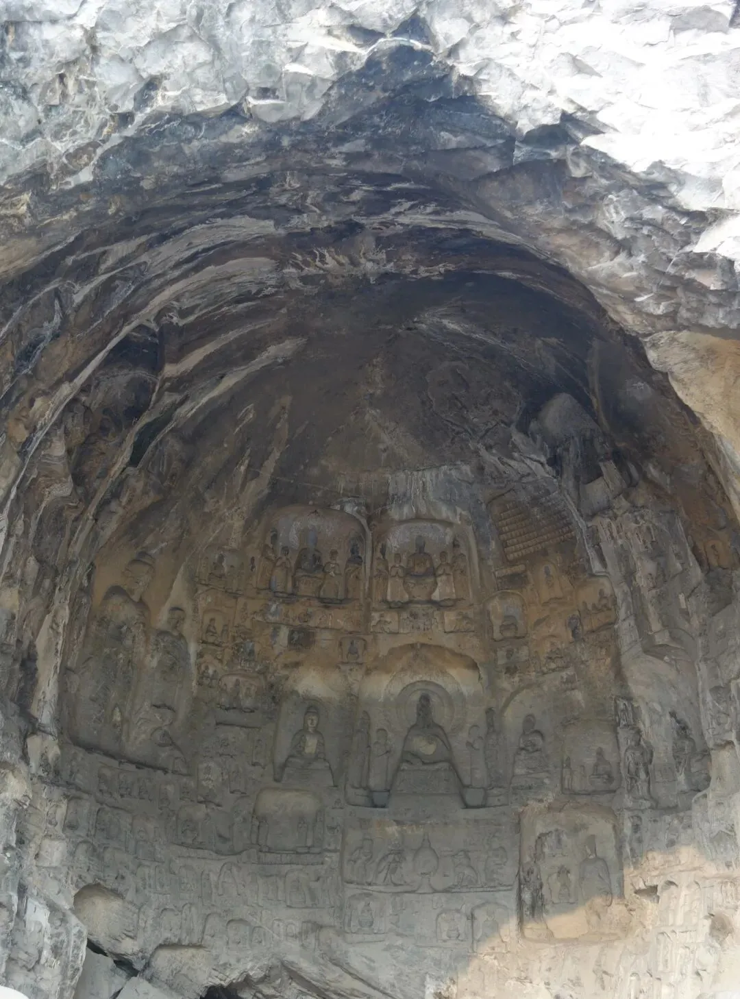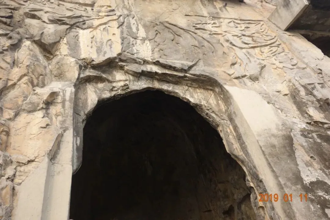 是龙门石窟中被破坏得最严重的一个石窟,此窟最值得观赏的,只有洞窟门楣的石刻了。