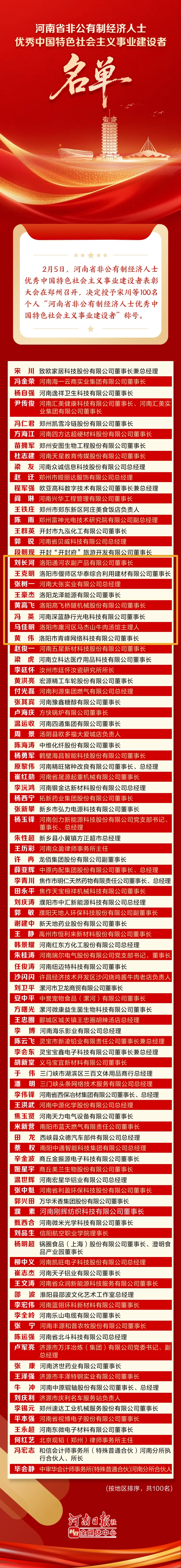 为表彰先进、树立典型,进一步激励我省广大非公有制经济人士坚定理想信念、保持发展定力、勇担时代重任,凝聚起团结奋进的强大力量,中共河南省委统战部、河南省工业和信息化厅、河南省人力资源和社会保障厅、河南省市场监督管理局、河南省工商业联合会决定,授予宋川等100名个人“河南省非公有制经济人士优秀中国特色社会主义事业建设者”称号。