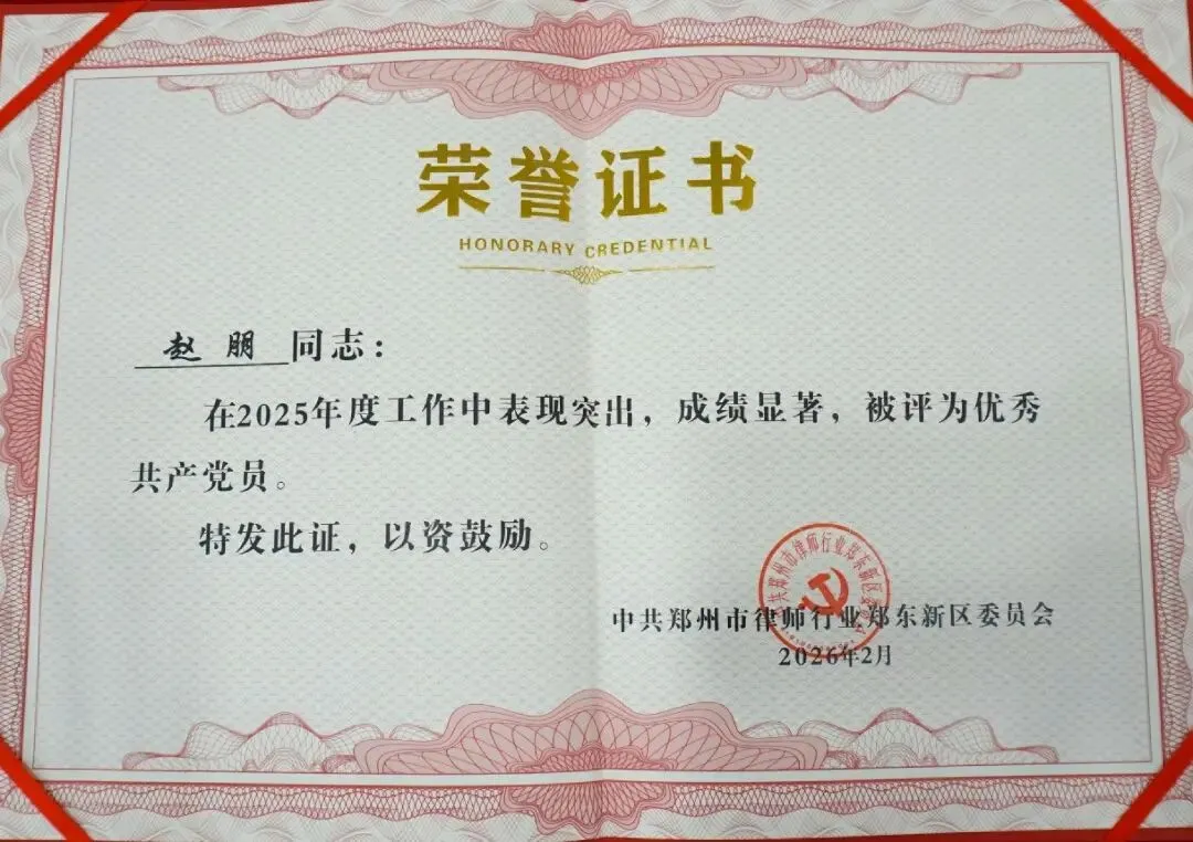 在执业过程中,赵朋律师始终牢记党员身份,将党的宗旨融入法律服务全过程。他带领团队精益求精,以高质量的专业服务维护当事人合法权益,在复杂疑难案件中展现出卓越的业务能力和职业素养,赢得了客户的广泛赞誉和行业的认可。