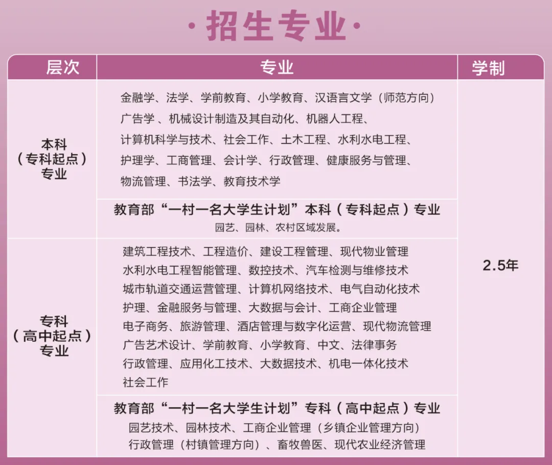 2、高中起点专科专业(1)招生对象为普通高中、职业高中、技工学校和中等专业学校毕业生或具有同等学力人员。