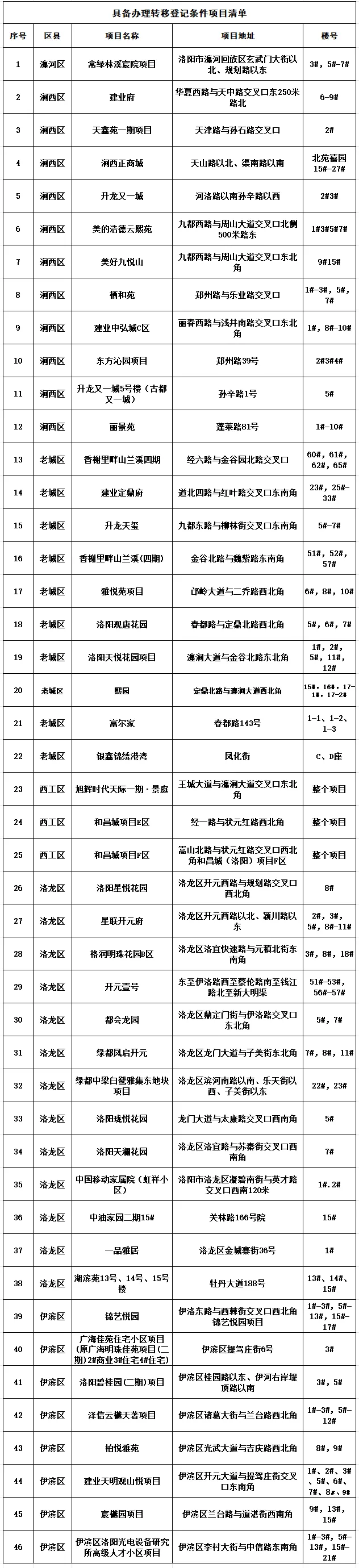 关于可办理转移登记楼盘的通告
