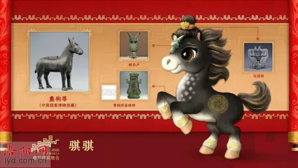 近日,中央广播电视总台发布了2026年春节联欢晚会吉祥物形象,四匹分别名为“骐骐”“骥骥”“驰驰”“骋骋”的骏马正式亮相。其中,“骐骐”头上佩戴的当卢装饰,设计灵感来源于洛阳出土的一件西周铜当卢。