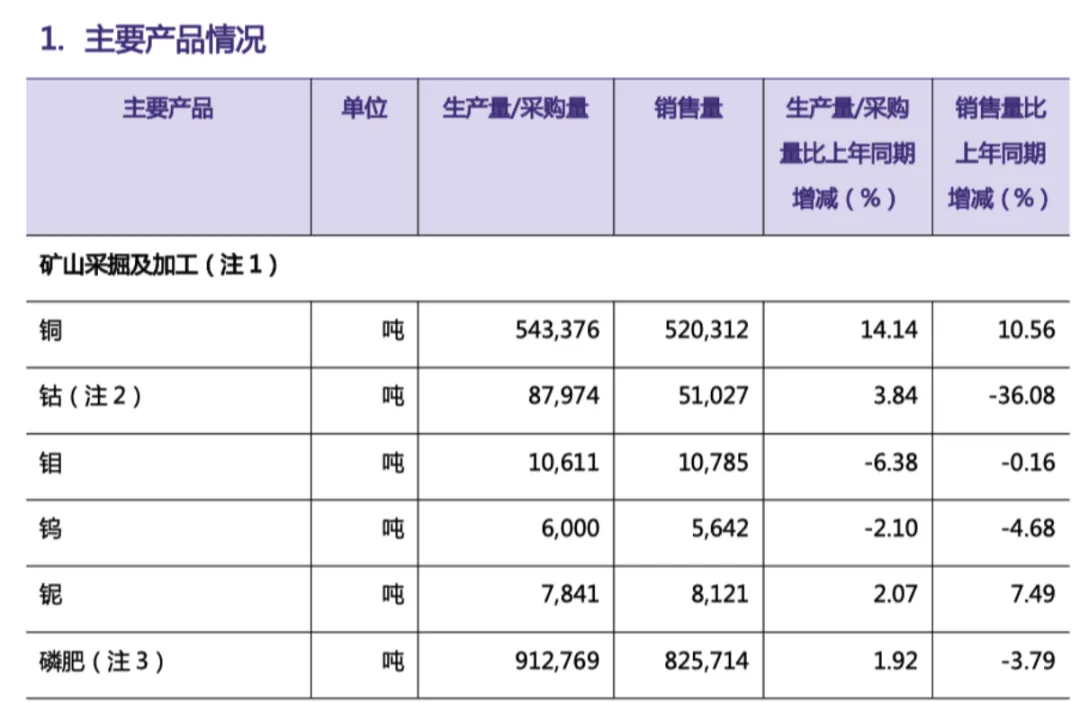 第一点产量方面,上半年公司各个产品(铜/钴/钼/钨/铌/磷肥)均超额完成2024年年度的指引计划。