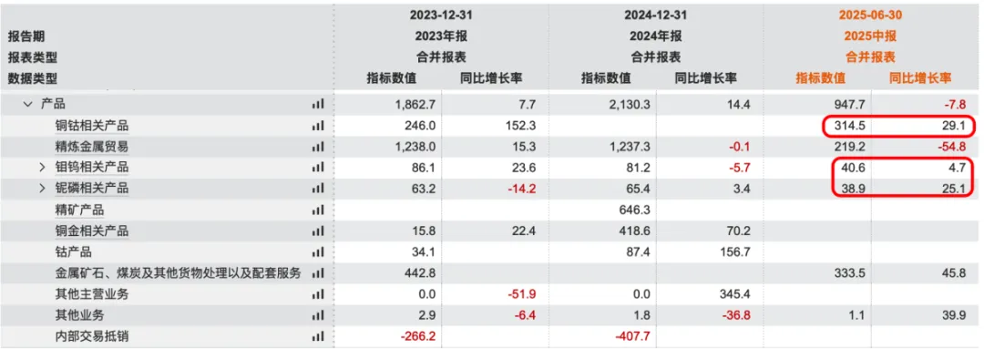 更具体的来说,铜钴收入增长29.1%,钨钼收入增长4.7%,铌磷收入增长25.1%,所有资源类产品收入都是增长的。