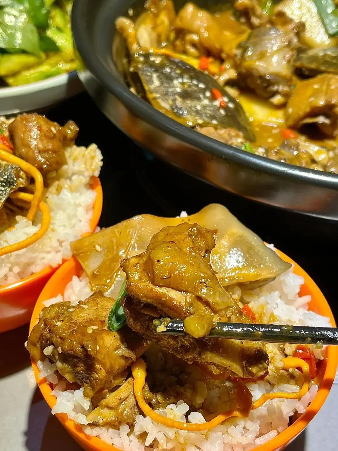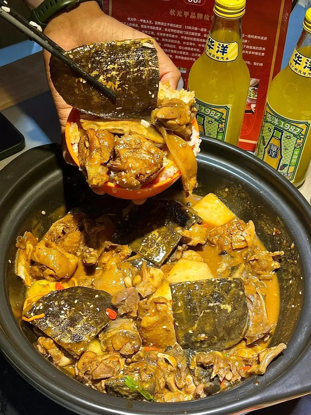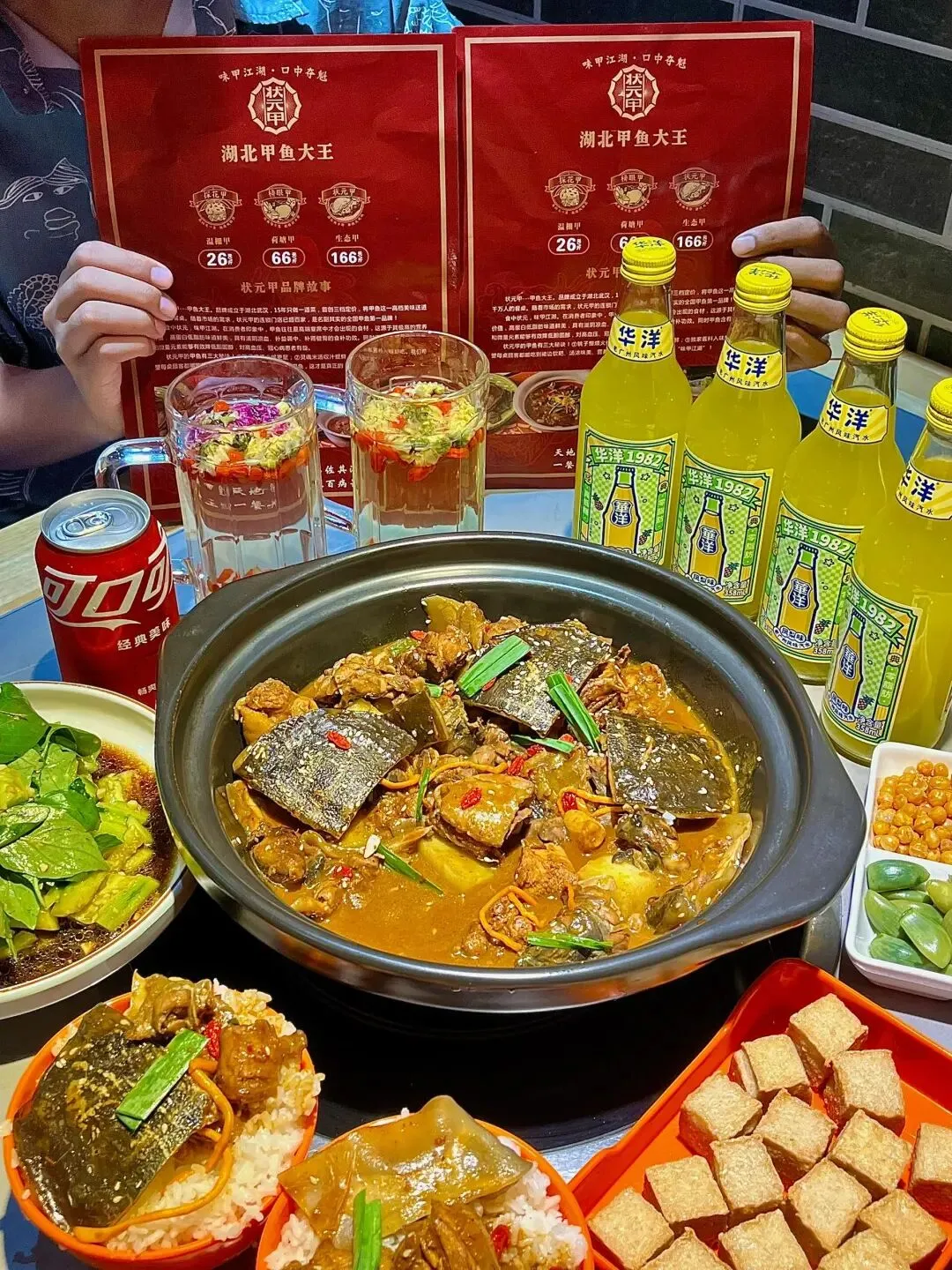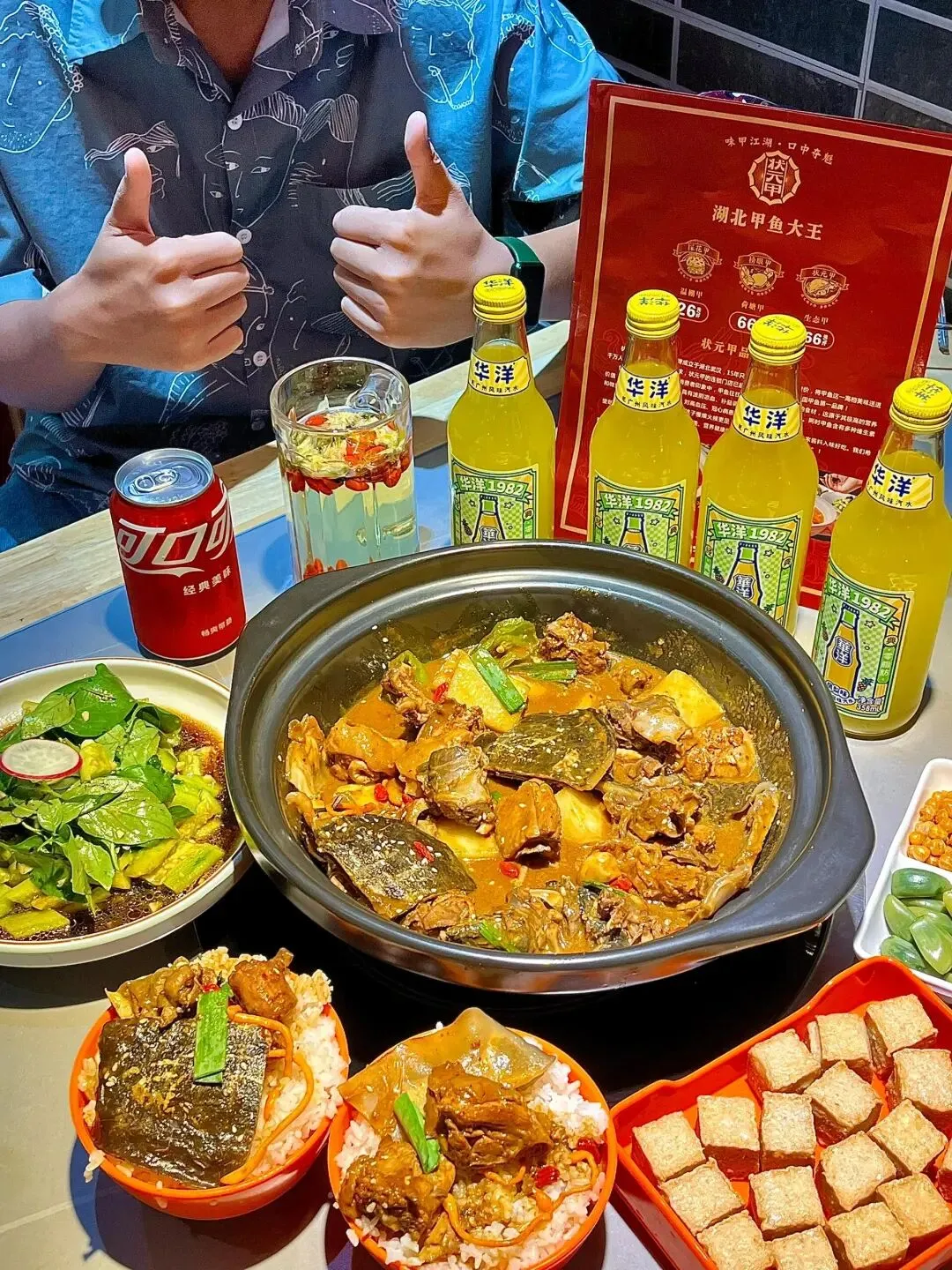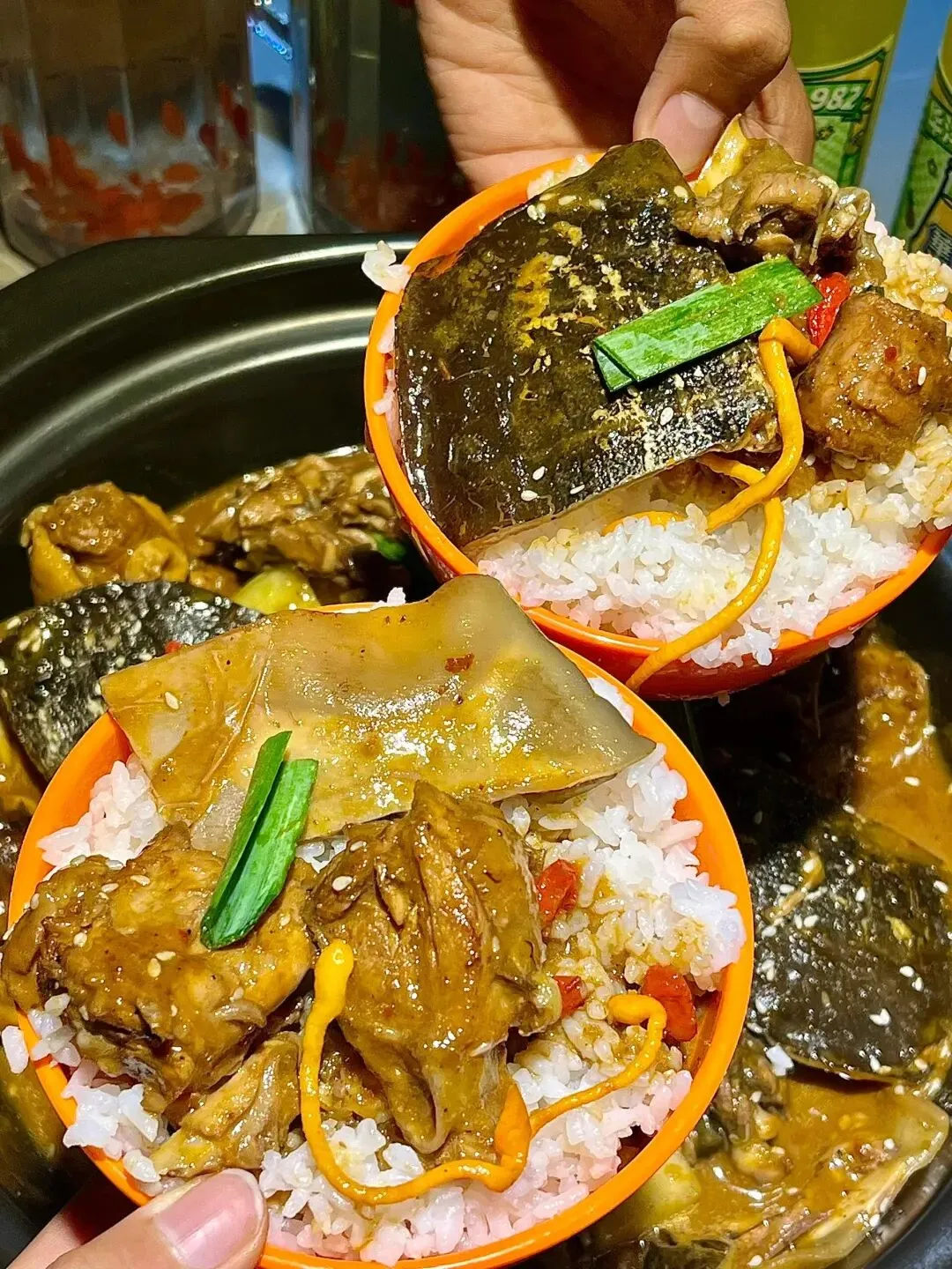 谁懂这一碗的滋补量!!第1️⃣次尝试这种大补的他家新鲜是看得见诶田鸡 黄鳝 甲鱼都是顾客可以亲自挑选的一个一个活蹦乱跳 ~根据斤两付 我们选的是甲鱼锅看见甲鱼眼里就冒星星 💫真的是QQ弹像果冻一样滑进嘴里 满满胶原蛋白 甲鱼肉质很紧实吃到最后 剩下汤汁可以加水涮菜 因为太香了汤汁浇米真的太下饭了!!再搭配几个凉拌菜很解腻~
