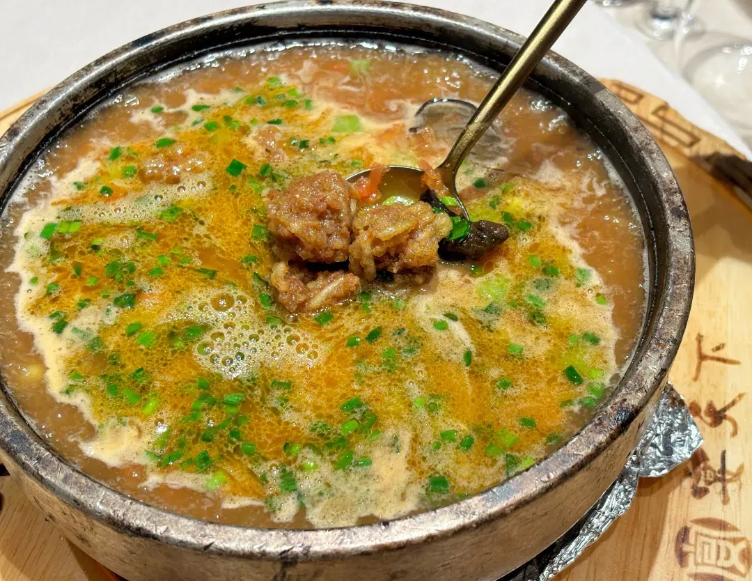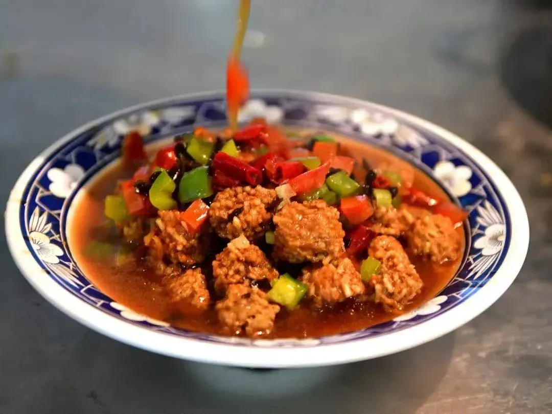 云罩腐乳肉是以腐乳、猪肉为主要原料,将猪肉切块炖煮至软烂,再淋上特制腐乳汁,肉质醇厚,腐乳香浓郁,口感咸甜适中,是水席中具有地方特色的菜品。焦炸丸子先将肉丸子炸酥脆,丸子端上桌后,浇入滚烫的酸辣汤中,丸子外层迅速吸汁变软,内里仍保持韧劲,形成声、香、味、感的多重享受,是水席中极具互动性的菜品。葱扒虎头鲤的鲤鱼肉质鲜嫩,搭配葱段慢火扒制,汤汁浓郁,是水席中的经典荤菜。