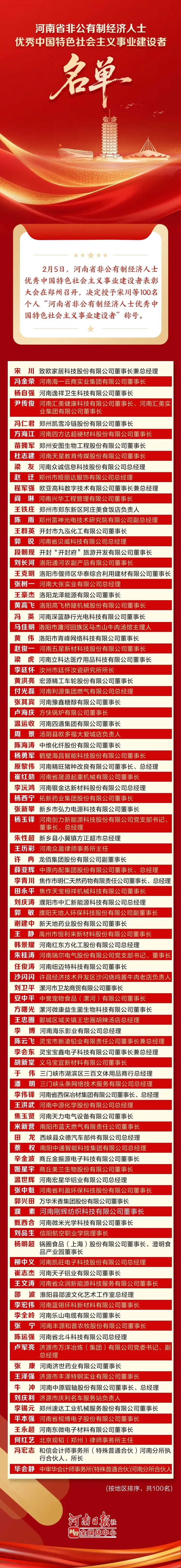 为表彰先进、树立典型,进一步激励我省广大非公有制经济人士坚定理想信念、保持发展定力、勇担时代重任,凝聚起团结奋进的强大力量,中共河南省委统战部、河南省工业和信息化厅、河南省人力资源和社会保障厅、河南省市场监督管理局、河南省工商业联合会决定,授予宋川等100名个人“河南省非公有制经济人士优秀中国特色社会主义事业建设者”称号。