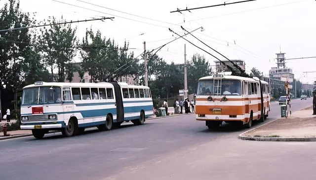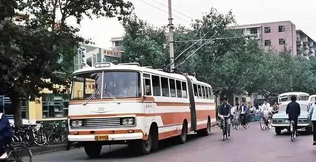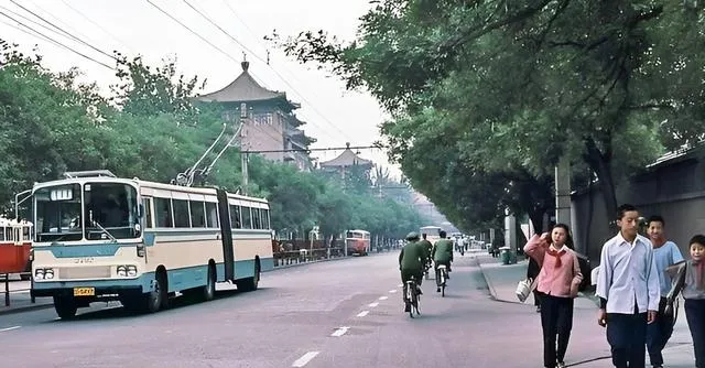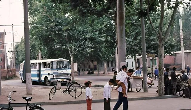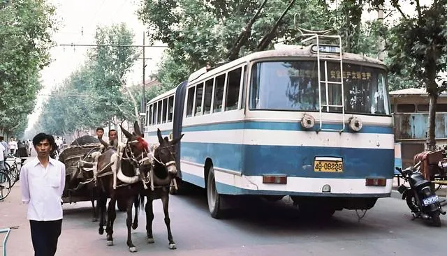 看这张有意思,蓝白公交后面跟着一辆毛驴车,木辕子嘎吱响,驴耳朵一抖一抖的,司机探头看一眼就慢下来,那时候的路,快慢都能走得下,心宽一点,城也宽一点。