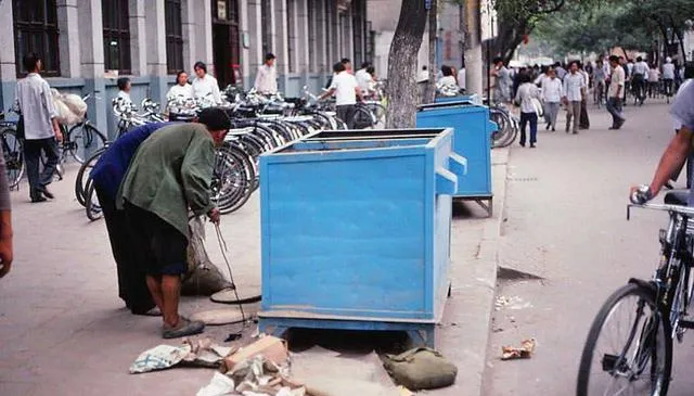 这蓝铁皮箱子现在看起来还挺时髦,当年可是街角标配,翻找的大爷手里拎着铁钩,边上是一排排自行车,妈妈说那会儿东西不多,扔掉的也有用,能卖点钱就算一天的菜钱,实打实的日子。
