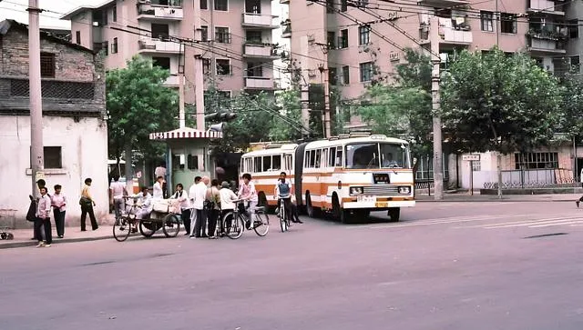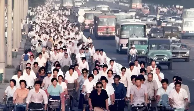 这幅画面真壮观,自行车挤成一片,铃声此起彼伏,衬衫一色白的多,偶尔夹一个黑墨镜的,那时候上下班靠腿,现在靠电和芯片,可奔忙的心思都一样。