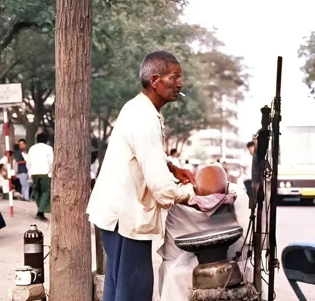 图里的师傅嘴上叼着烟,手上拿着剃头刀,石墩当椅子,热水瓶当洗头间,爸爸笑我说,小子坐稳点,别乱动,一毛五一回头,干净利落,晒着太阳就把型给整了。