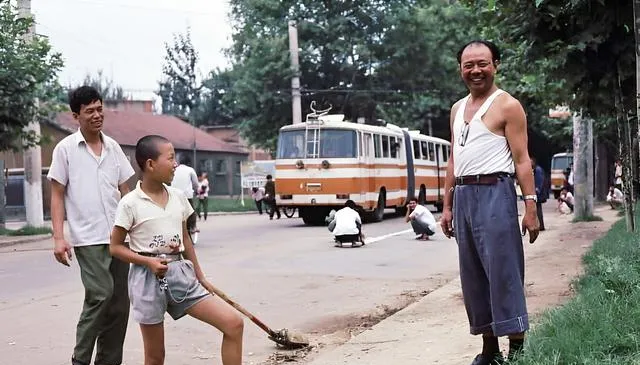 这是电车公司的人,穿着汗衫,笑得挺敞亮,旁边小孩拿着竹扫帚,一点一点把路牙沟里的泥巴往外刮,电车远远停着等,那会儿人人懂得把路让出来,顺手就把城市拾掇干净了。