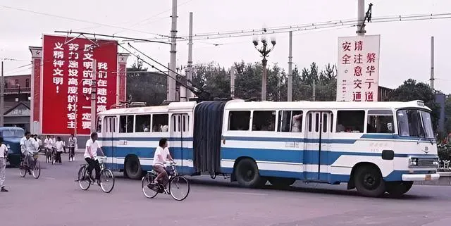 这辆蓝白铰接车中间那道风琴皮折起来像褶子,路口立着醒目的红底白字宣传标语,字儿大得很,提醒骑车的人注意安全,以前靠口号提劲,现在靠提醒把关,意思都在。