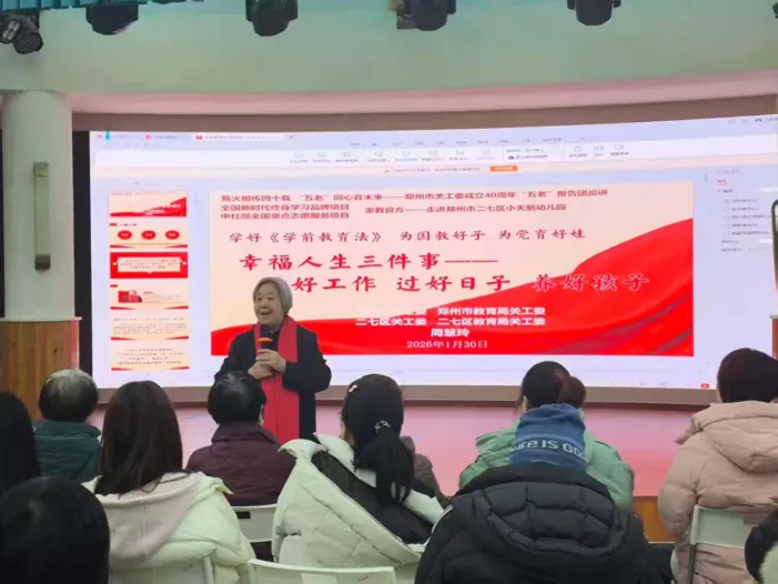2026年1月30日下午,小天鹅幼儿园以“专家引领赋能· 双向奔赴共育——解锁幼儿园家庭教育新路径”为主题,特邀全国离退休干部先进个人、全国家庭教育工作先进个人、“五栖”资深教育专家周慧玲老师,带来《幸福人生三件事—干好工作,过好日子,养好孩子》专题讲座。二七区关工委副主任黄晓江,二七区教育局关工委主任张俊航参加报告会,与全体家长共同见证这场育人盛事,活动由幼儿园执行园长徐娟主持。