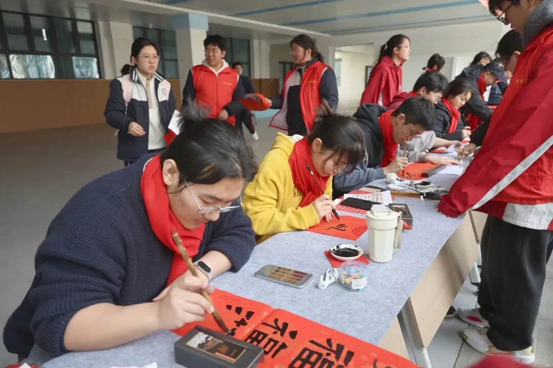 金驹启岁,墨韵传情。为弘扬中华优秀传统文化,营造喜庆祥和的新春氛围,丰富校园文化生活,2026年2月5日,郑州市第六高级中学书法社在教学楼一楼连廊举办“翰墨飘香”写春联、送福字、印年画新春志愿服务活动。学校师生欢聚一堂,挥毫泼墨,以笔墨寄心意,以红纸载祝福,让浓浓年味与传统文化在校园里温情流淌。