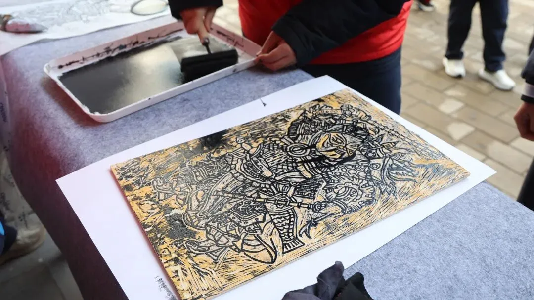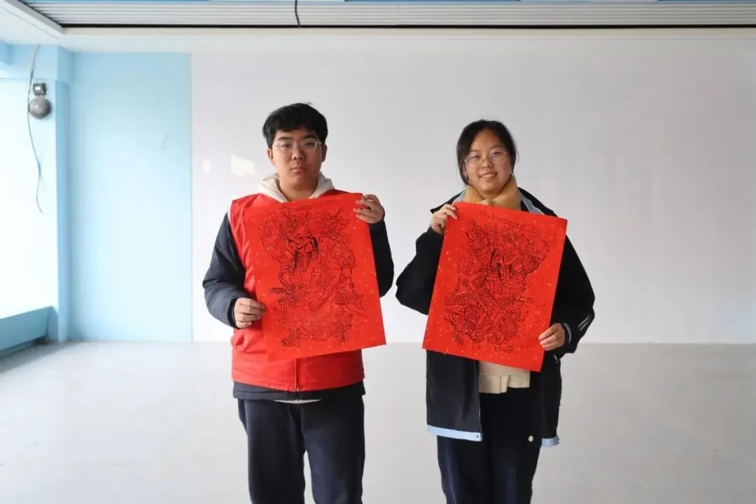 除了写春联、送福字活动,现场还增设了木版年画印制体验,成为本次活动的一大亮点。同学们亲手操作雕版、上墨、覆纸、拓印,一张张线条苍劲、寓意吉祥的传统木版年画新鲜出炉,门神、瑞兽、吉祥纹样跃然纸上,古朴厚重的民俗艺术让大家近距离体验非遗技艺,触摸传统文化的根脉。