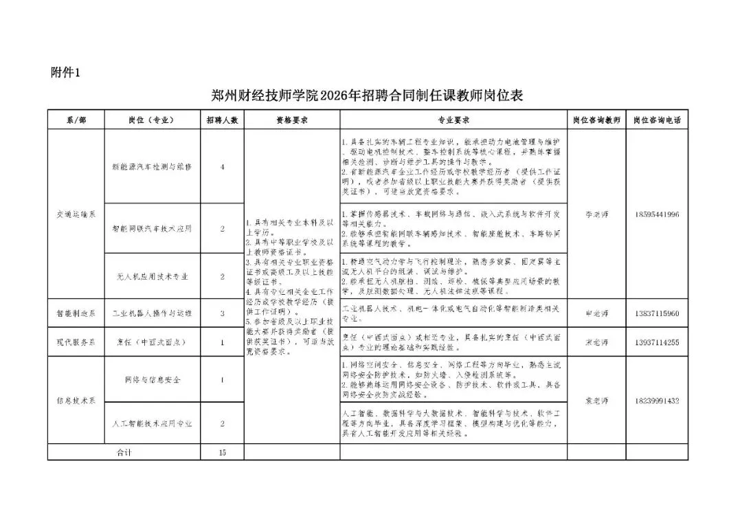 本次招聘合同制任课教师15名,具体岗位及要求详见《郑州财经技师学院2026年招聘合同制任课教师岗位表》(附件1)。招聘外聘兼职教师19名,具体岗位及要求详见《郑州财经技师学院2026年招聘外聘兼职教师岗位表》(附件2)。