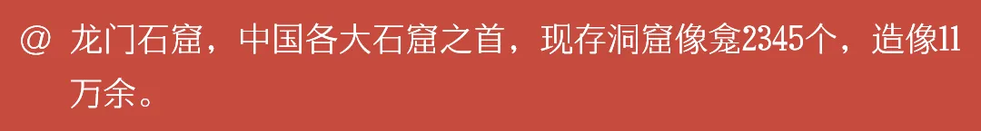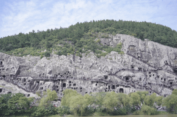 “洛都四郊,山水之胜,龙门首焉”。龙门石窟开凿于北魏孝文帝年间,之后历经东魏、西魏、北齐、隋、唐、五代、宋等朝代连续大规模营造达400余年之久,南北长达1公里。龙门石窟存有窟龛2345个,造像10万余尊,碑刻题记2800余品。