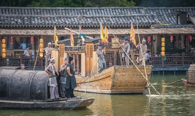 《包公巡视汴河漕运》在汴河水面观看惊险刺激的水战表演。包拯化解了假扮官员的匪徒拦截漕运船队的危机。