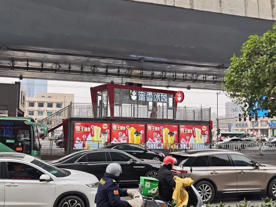 2月5日下午,正观新闻记者踏入郑州花园路BRT站台,红白相间的两层店面格外醒目,蜜雪冰城的招牌已经亮灯。这家位于花园路与农业路交叉口西侧的蜜雪冰城店铺,已于2月2日开始试营业,预计春节后正式营业。