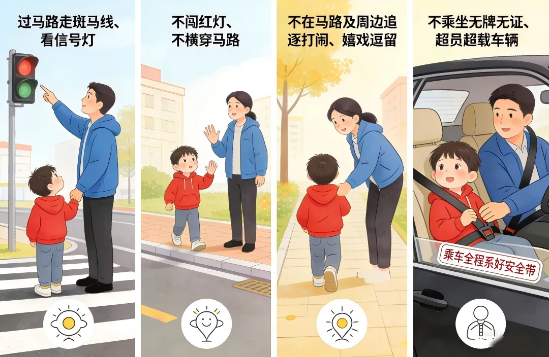 1.教育孩子外出时严格遵守交通规则,过马路走斑马线、天桥或地下通道;不闯红灯,不在道路上嬉戏打闹,不突然横穿马路,牢记“一停、二看、三通过”。
