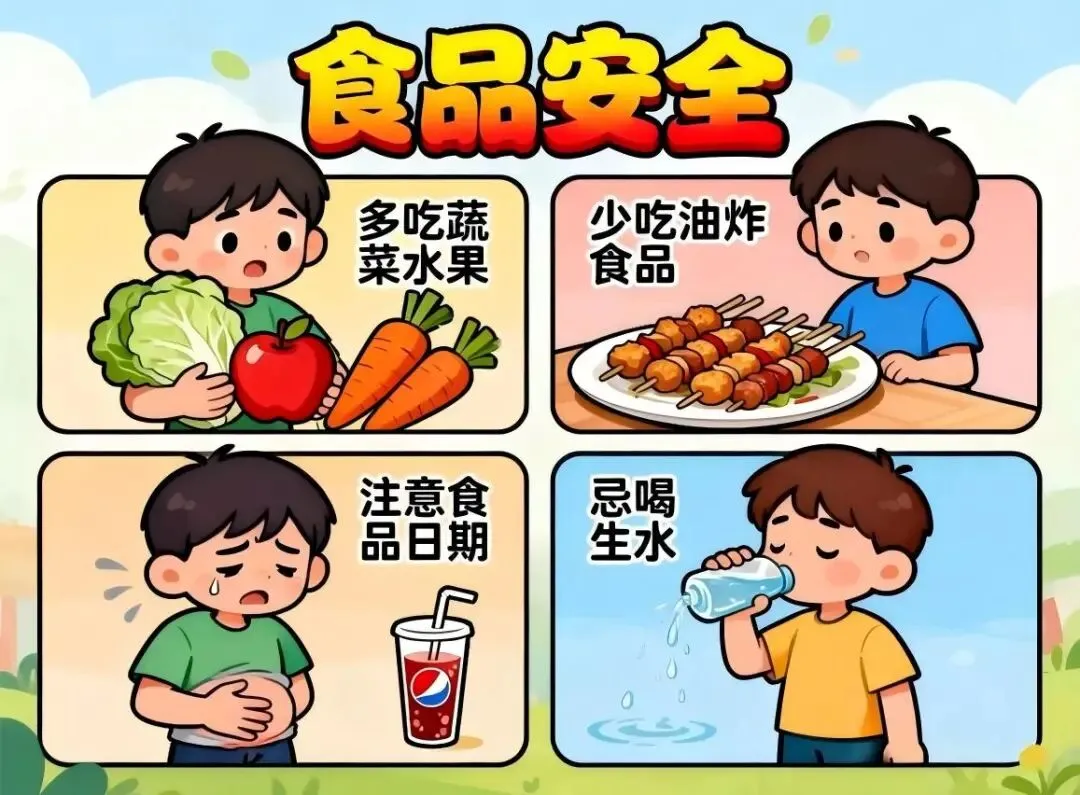 3.为孩子合理搭配饮食,保证谷物、蔬菜、水果和优质蛋白均衡摄入,减少生冷、辛辣、油腻食物;引导孩子多喝白开水,远离“三无食品”、过期食品和街头无证摊贩售卖食品,做到饮食规律、不暴饮暴食,少吃零食、油炸食品,养成定时定量的良好饮食习惯。