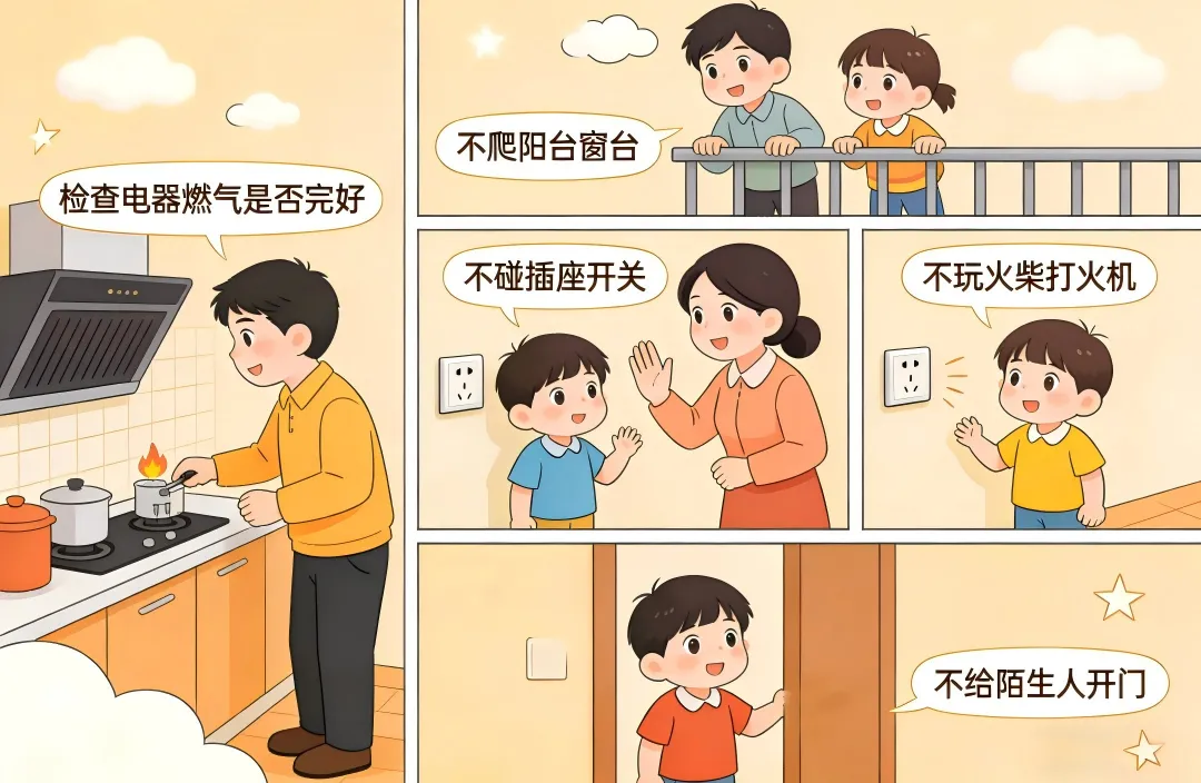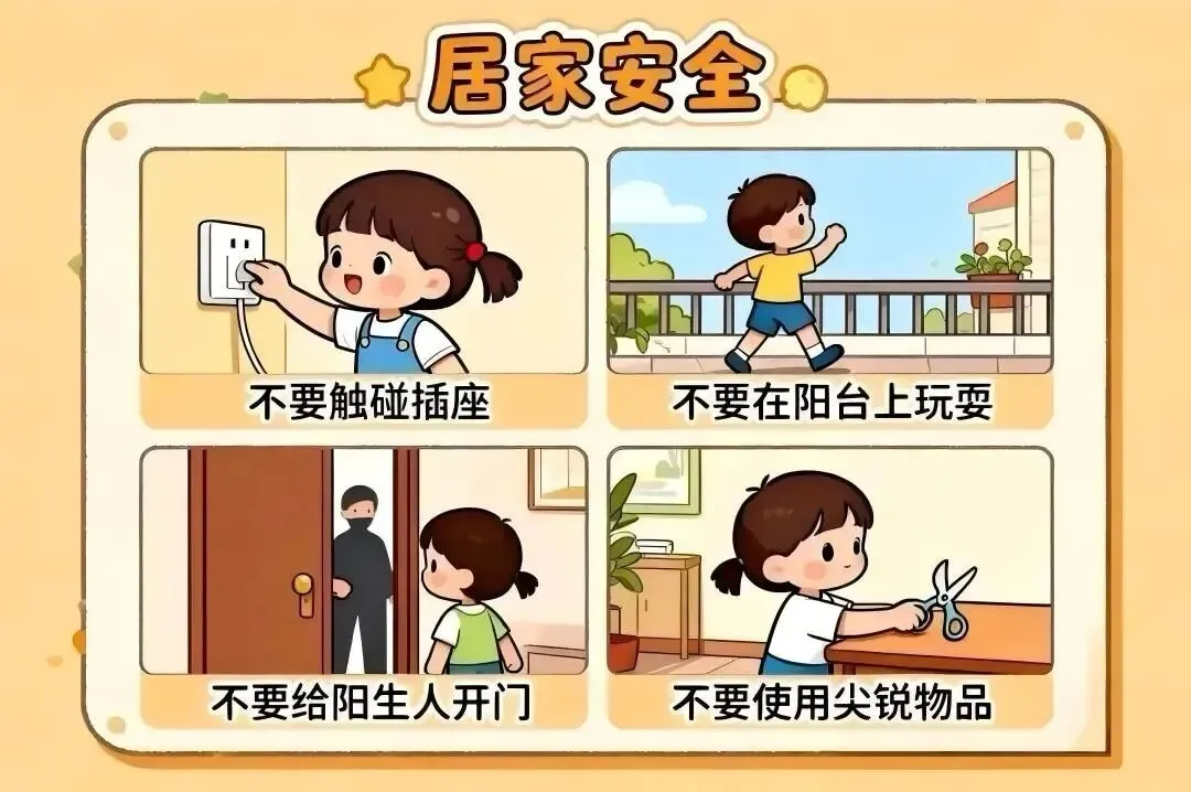 1.做好阳台、飘窗、平台等区域安全防护,加装牢固防护栏;教育孩子不高空抛物、不攀爬阳台门窗等高处,谨防摔伤坠落。