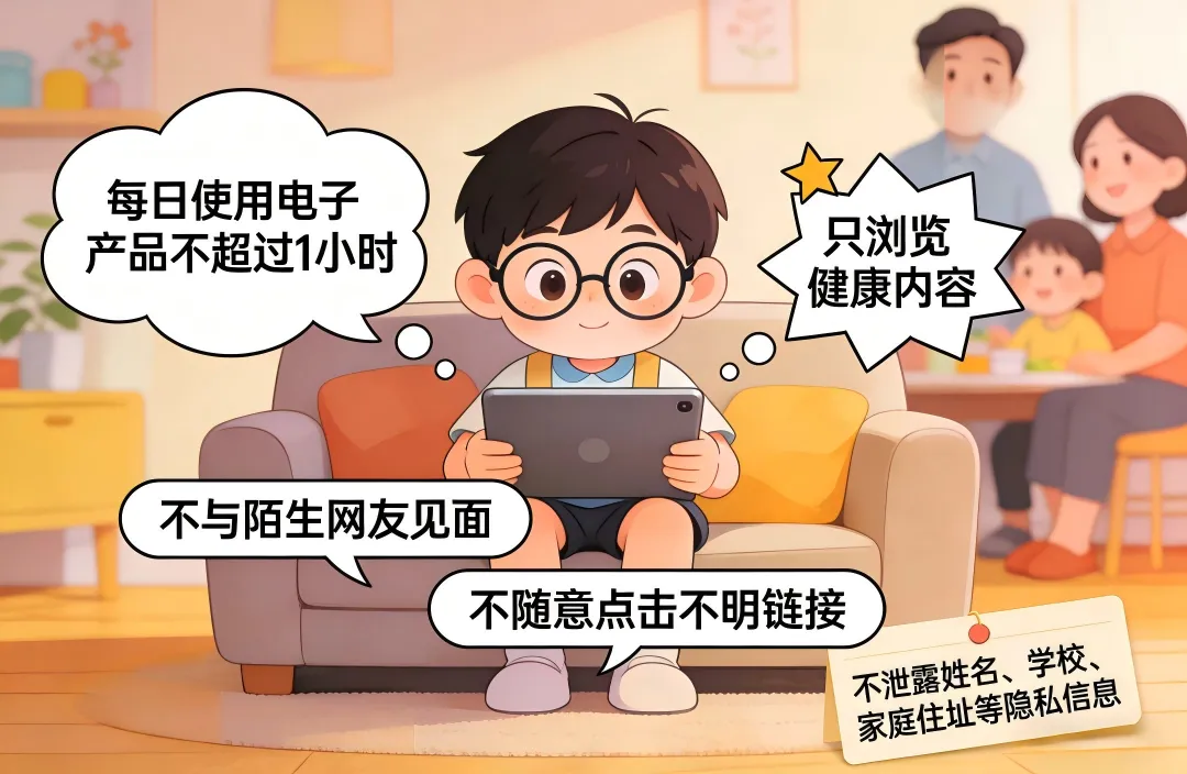1.合理规划孩子使用电子产品的时间,引导孩子科学上网、适度娱乐,避免沉迷网络游戏、短视频;家长要以身作则,减少在孩子面前使用电子设备的频率,多通过亲子共读、户外运动、手工制作等方式高质量陪伴孩子。