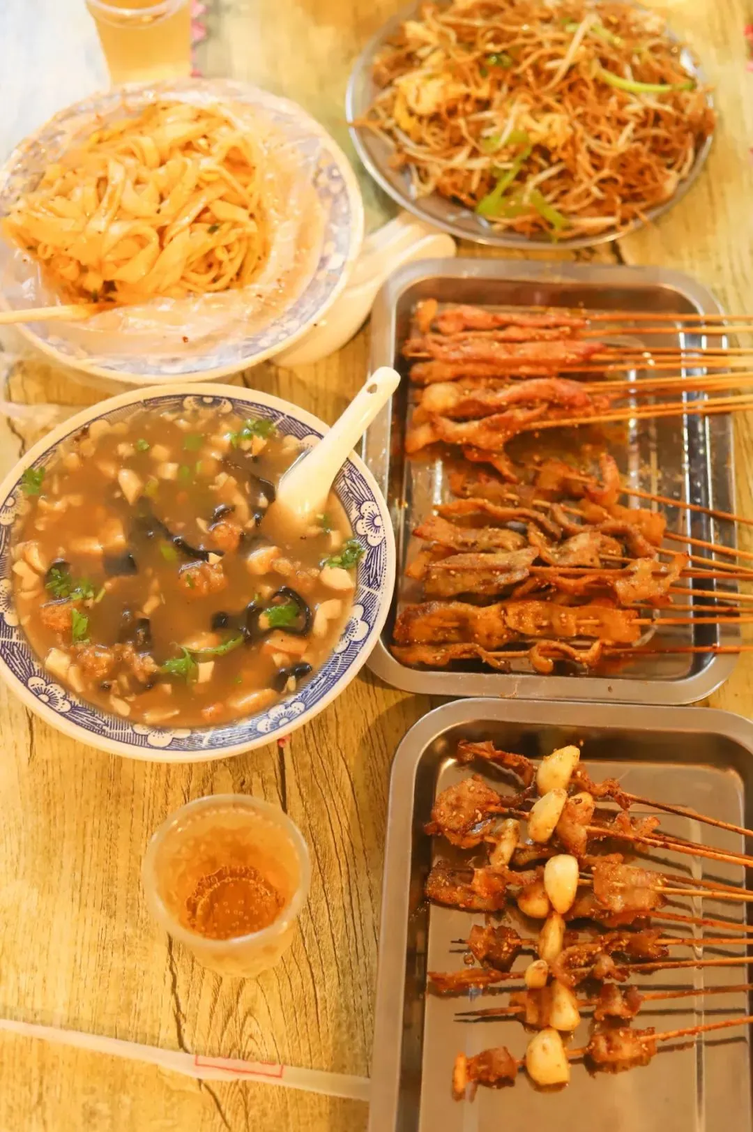 Wan小瑛:这家店像我在宜阳吃的小板筋,炒饼丝,真的是饼丝,烤的串都是小小一把,但分量并不小,味道也很好。值得去的一家店,就是环境真的很一般,别的都还不错啦。