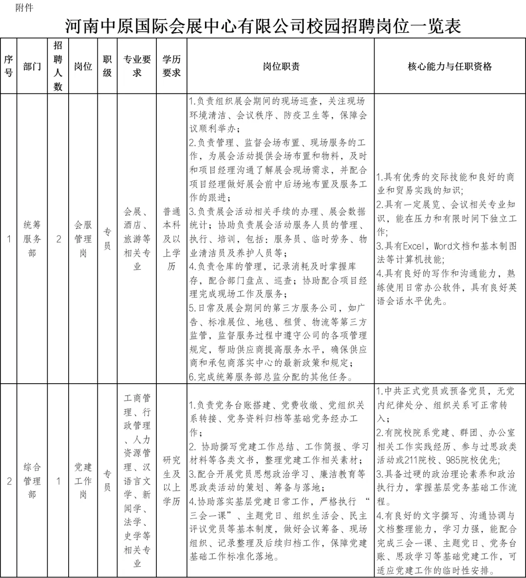 具体招聘岗位、任职要求、人数详见《河南中原国际会展中心有限公司校园招聘岗位一览表》