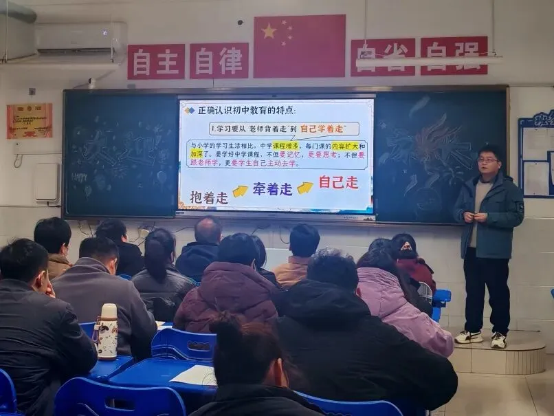 七年级的家长们首先齐聚学校报告厅,开启家长会第一个环节:家长学校讲座,主讲人张红建校长以 “如他所是,才如我愿” 为核心,强调家庭教育的本质是接纳孩子的独一无二,而非塑造 “标准答案”。针对初一衔接期孩子,家长要接纳其适应慢、不完美,尊重小自主,避免过度管控。家庭教育需回归生活本质,注重道德培养、习惯养成与劳动教育,践行 “三不惯两不管” 原则。父母要做好榜样示范,言传身教,构建有爱、安全、爱学习且民主的家庭环境。同时,家校需秉持一致教育理念,协同育人,以 “辨材施教” 的耐心与尊重,陪伴孩子健康成长。
