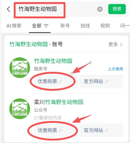 微信搜索“竹海野生动物园”,即可点击抢购