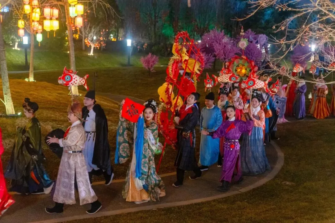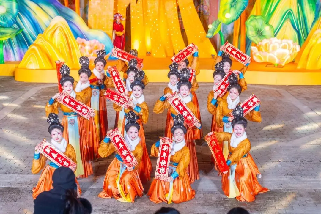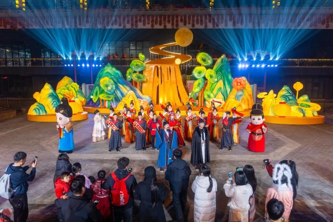 “牡丹栖凤·上元聆香”“天马驮文·洛水寻源”“凤阙临朝·万国衣冠”“九陌踏歌·烟火如织”四大主题场景,将特色灯组与皇家园林场景巧妙融合,让你在璀璨光影中邂逅盛唐气象,感受古韵新风的文化氛围。