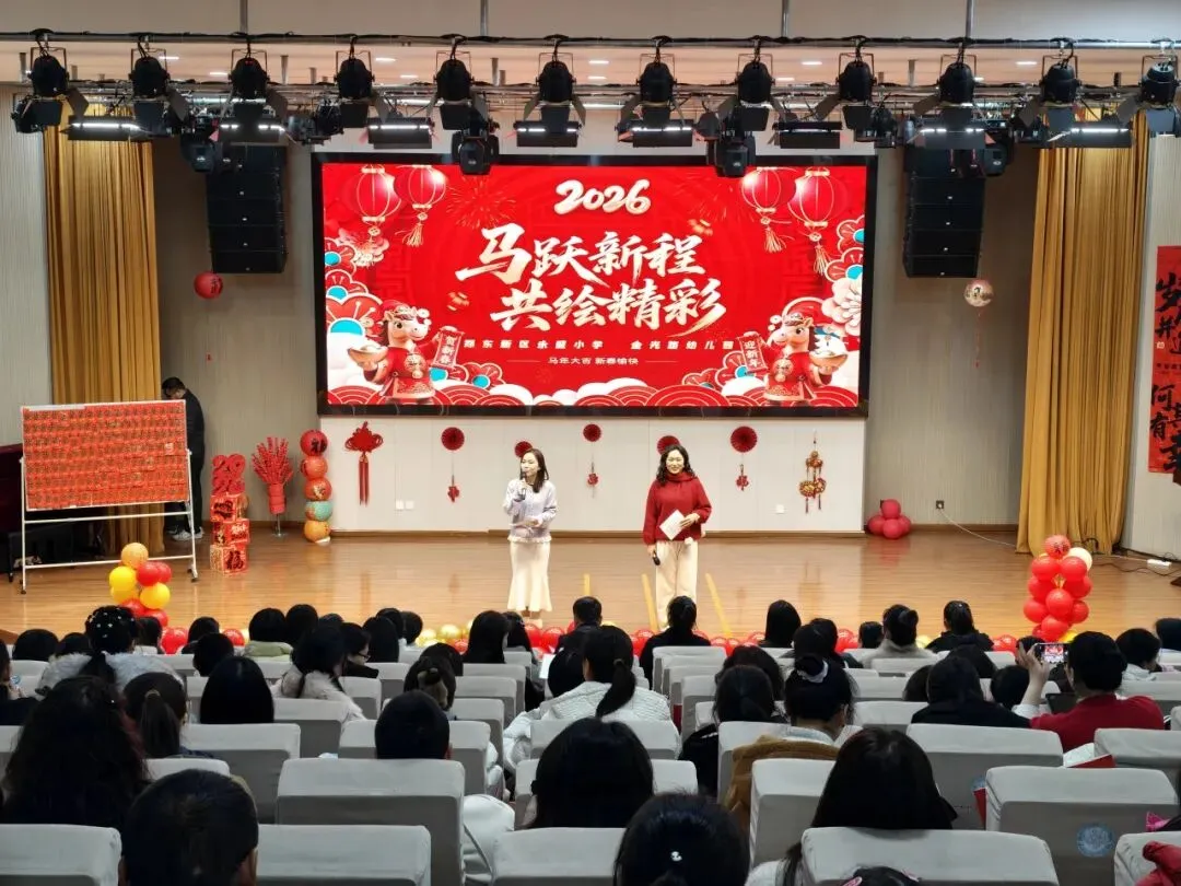 岁末添喜,欢聚今朝。2026年2月5日,永盛小学总支部委员会书记蒋蕊、校长李志方携全体教职工齐聚报告厅,共同参加以“马跃新程 共绘精彩”为主题的期末总结会。整场活动以温暖互动、趣味游戏、荣誉表彰交织呈现,在欢声笑语中回顾耕耘岁月,在殷切期许中展望崭新征程。