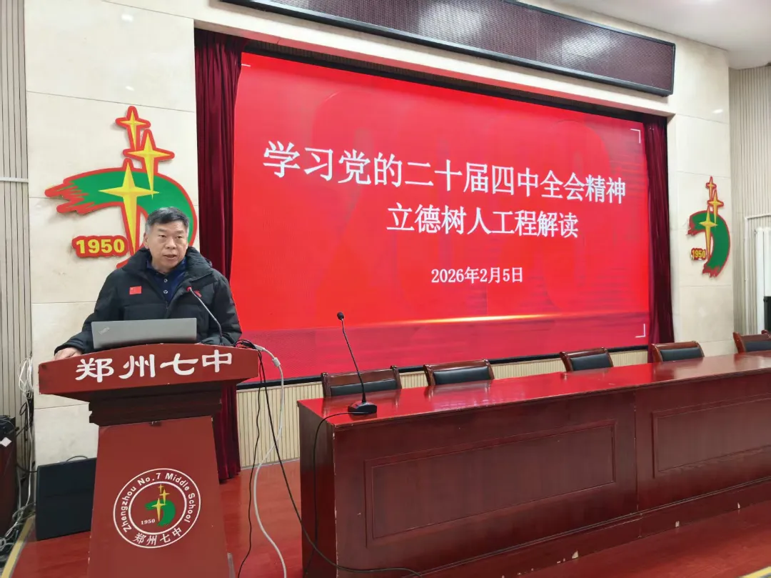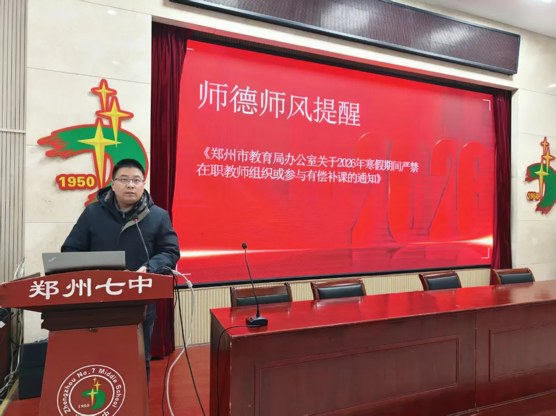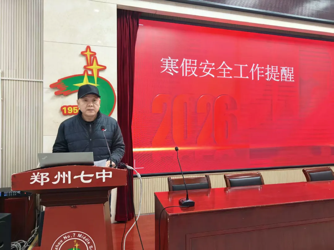 2026年2月5日上午 9 时,郑州市第七初级中学期末全体教职工大会在学校报告厅顺利召开,全体教职工齐聚一堂,共同回顾学期工作、部署寒假重点任务。