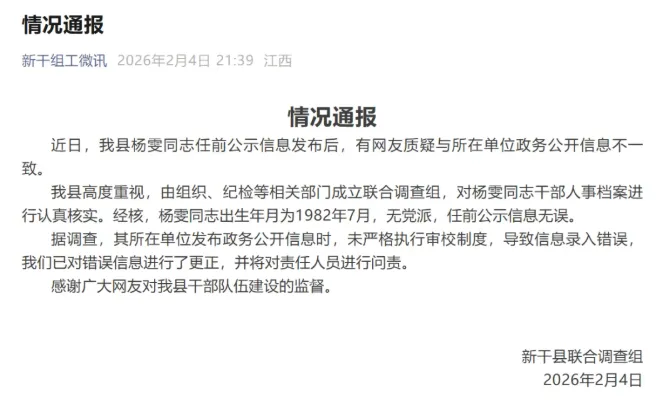 官方通报“江西一女干部晋升公示年龄变小4岁”:其所在单位发布政务公开信息时,未严格执行审校制度致录入错误,已更正,将问责责任人。