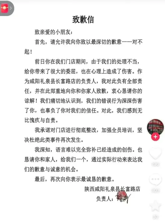2月5日,针对“误把初中女孩当小偷扣留20分钟”一事,好想来涉事门店发布致歉信:将进行彻底整改,加强全员培训。