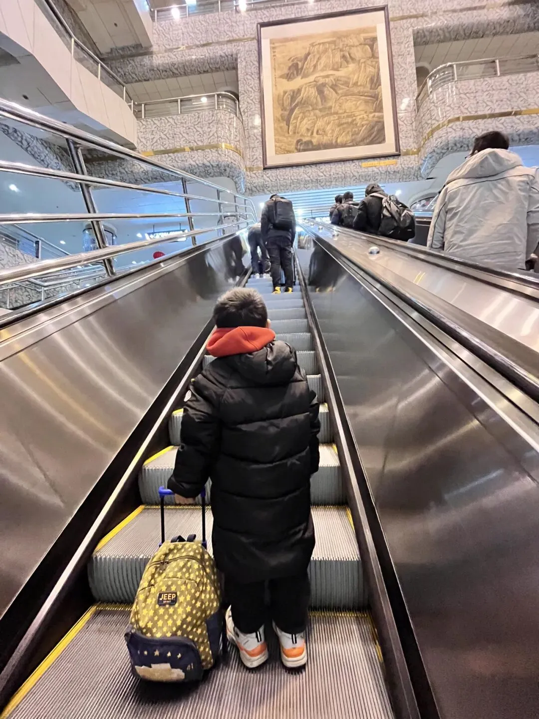 从中转折返回去到出站口,又一次提着行李箱走过楼梯,出了站口,望向那近3、4米的楼梯,只能咬牙承受了。出了门,很多人热情问去哪?坐啥车?住不住……东进站口进去发现买票的还在外面,于是出了进站口又走了一段距离才走到售票处,还好排队买票的人不多~买到后就又走进站内检票,这次有个高高的电梯上去了,进入候车室才算稳下来!